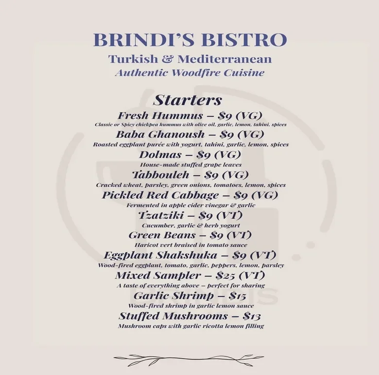 Our menu features traditional Mediterranean dishes inspired by Turkish and Greek cuisine, prepared fresh daily.